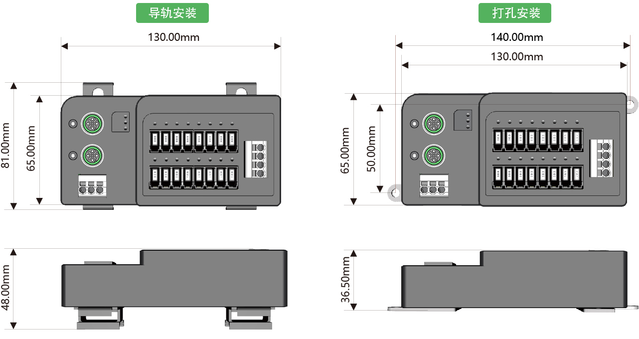 安裝方式:DIN35導(dǎo)軌安裝或雙側(cè)耳打孔安裝